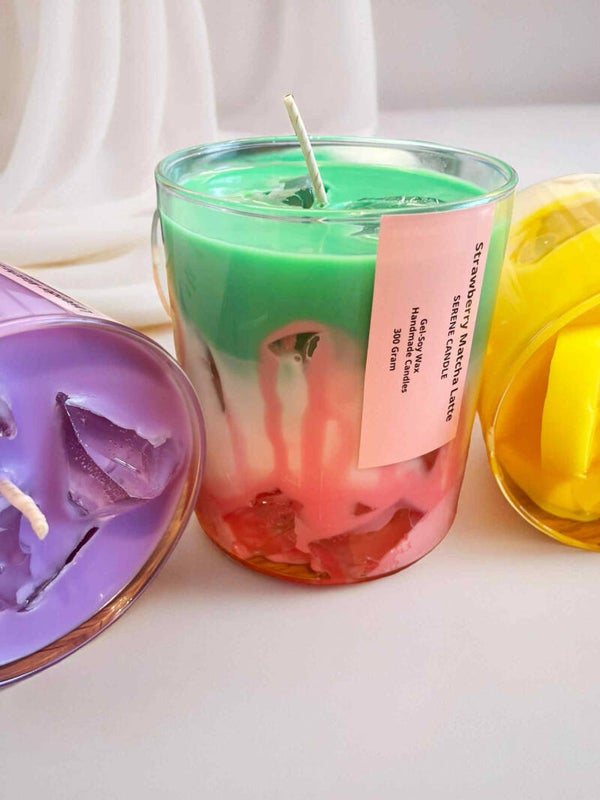 The top layer features fresh, earthy matcha with hints of strawberry sweetness, along with strawberry-scented gel wax "ice cubes" for a fun, fruity touch.