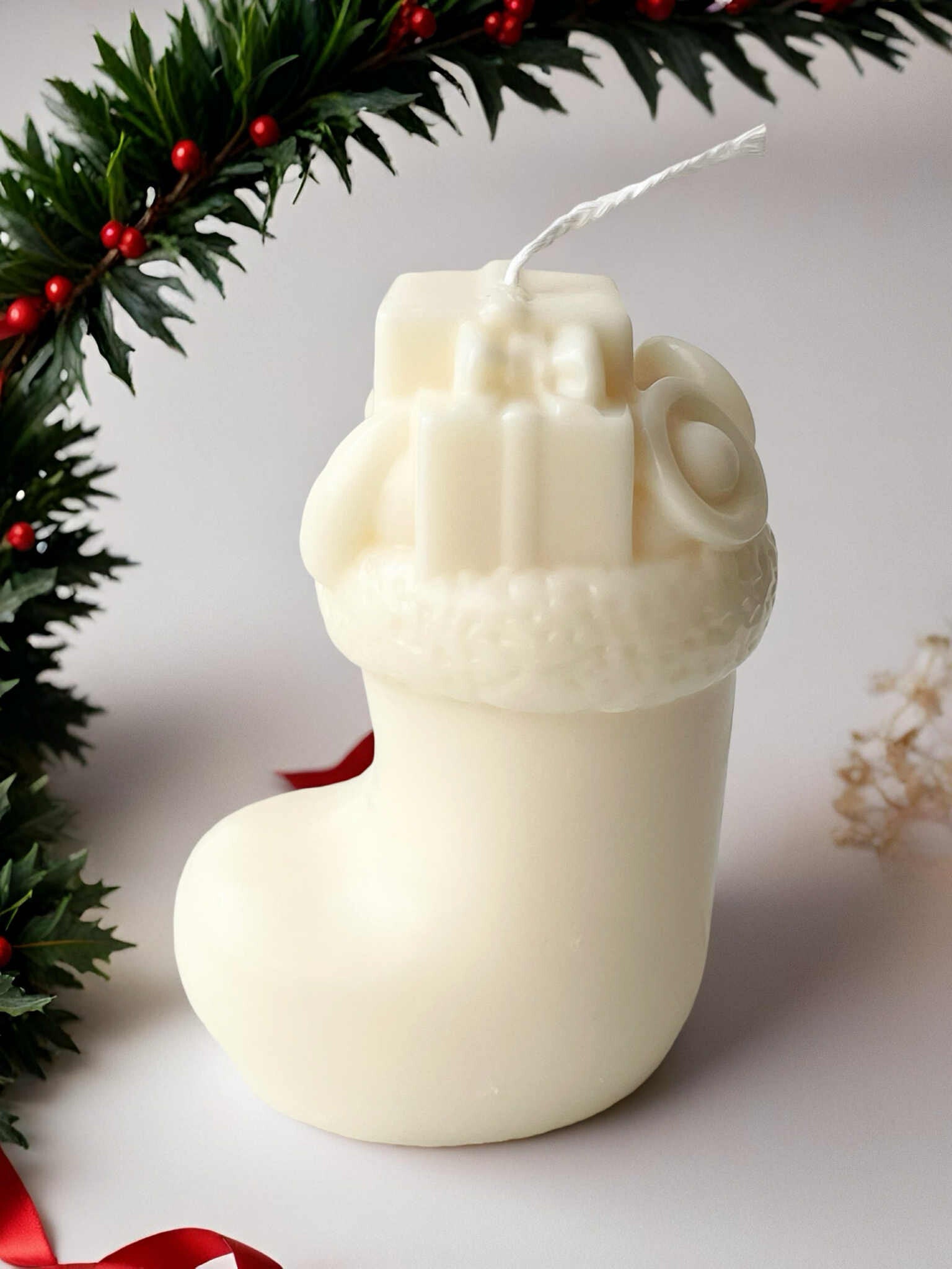 Cozy up your space with this charming decorative candle shaped like winter boots filled with little gifts.